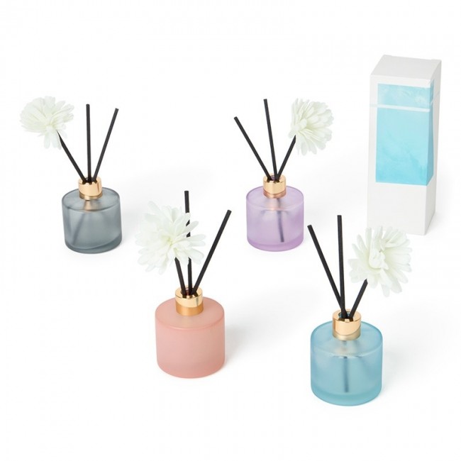 Un ambientador en tonos pastel, lleva uans varillas para que aroma vaya saliendo lentamente, y va metido en una caja.