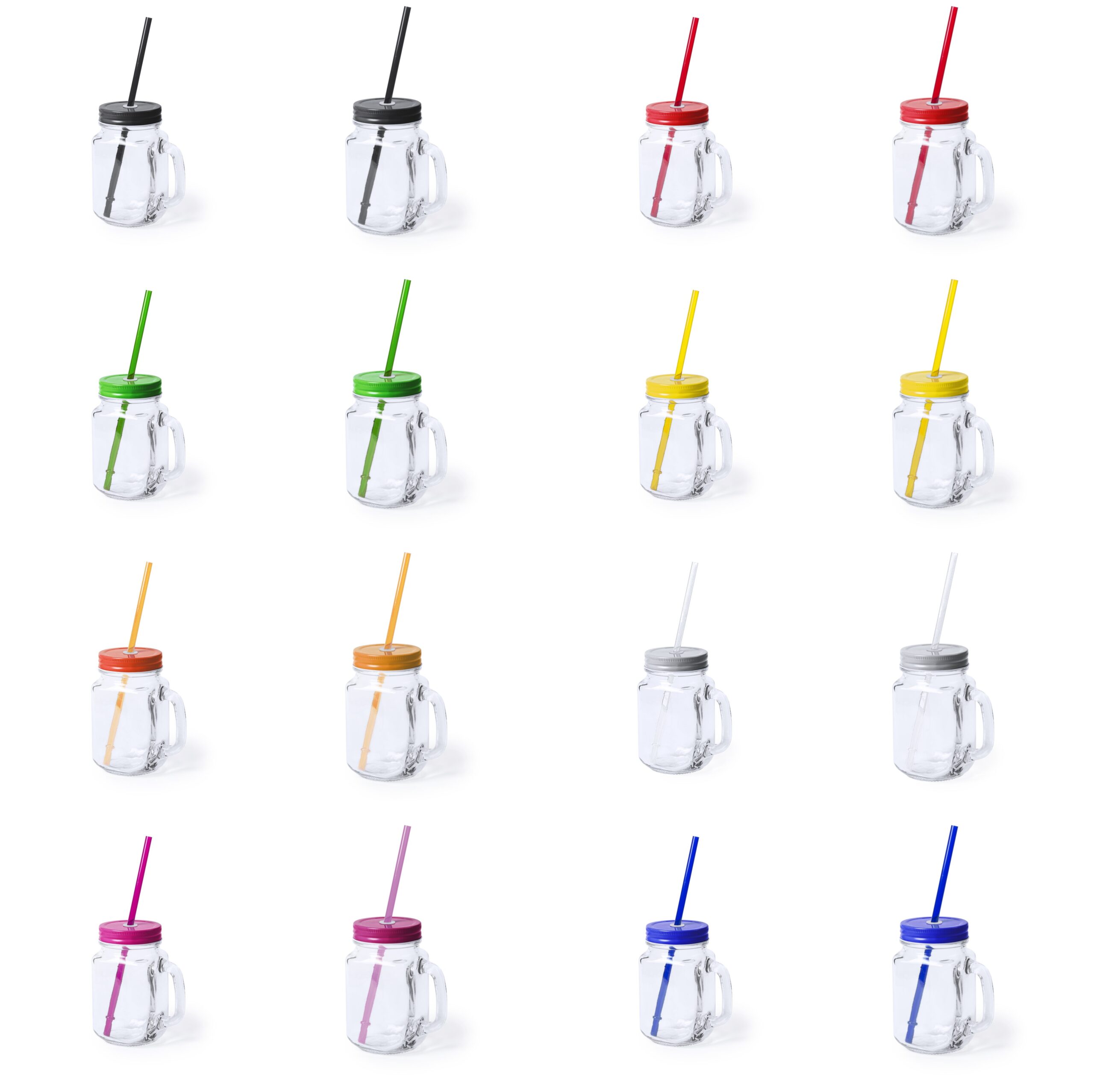 Jarra multiusos de cristal de 500ml de capacidad con tapa y pajita en vivos colores.