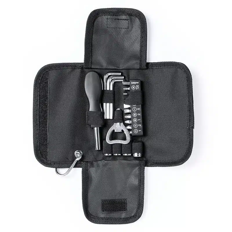 Set de herramientas de 19 accesorios en resistente estuche de poliéster con cierre de cremallera. Incluye herramienta de fijación, cabezales destornilladores planos, de estrella y tipo torx, set de llaves tipo allen, llaves para tuercas de cabeza hexagonal y abridor. Con mosquetón metálico de transporte.