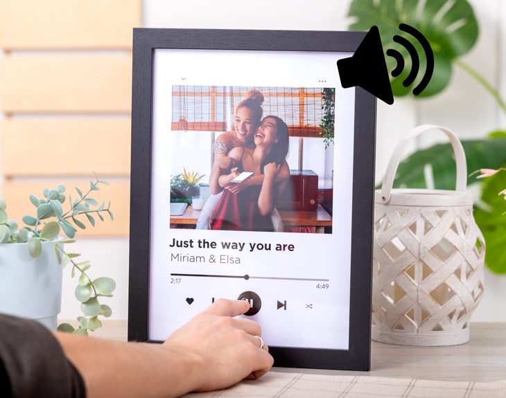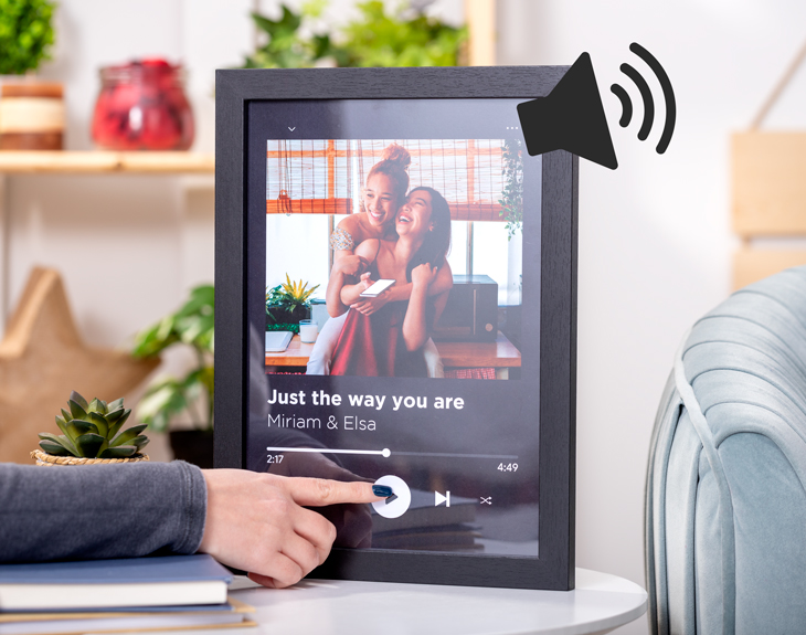 ¿Y lo mejor? Además de ser una lámina decorativa, ¡también es un reproductor de música! Cada vez que la persona que reciba este regalo quiera revivir esa canción especial, podrá pulsar el botón en la lámina y disfrutar del sonido que les transportará a ese instante tan significativo. Un regalo que habla de vuestro amor y de los momentos que nunca queréis olvidar. ¡Ideal para cualquier ocasión!