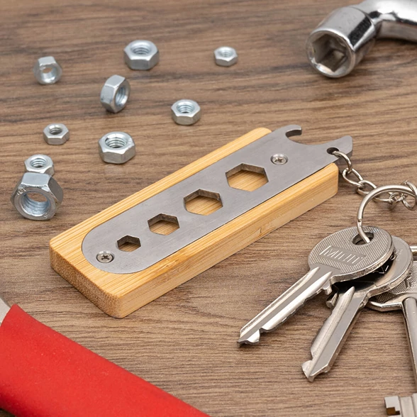 Este ingenioso llavero es un ejemplo perfecto de cómo la funcionalidad y el diseño se combinan en un paquete compacto. Está fabricado en acero inoxidable (la parte con las herramientas) y en madera de bambú (la estructura general del llavero). El acero inoxidable garantiza durabilidad y resistencia al desgaste, mientras que la madera de bambú aporta un toque de elegancia y calidez al producto.