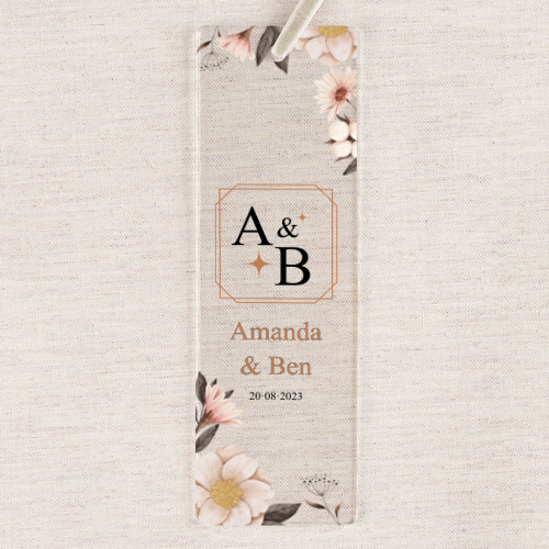 - Originales puntos de libro hechos de metacrilato transparente. Se personalizan por una cara, y al ser transparentes, el acabado final es espectacular y muy diferente. Es perfecto para regalar a invitados de eventos y, al igual que los de madera, incluye cinta de terciopelo de diferentes colores.