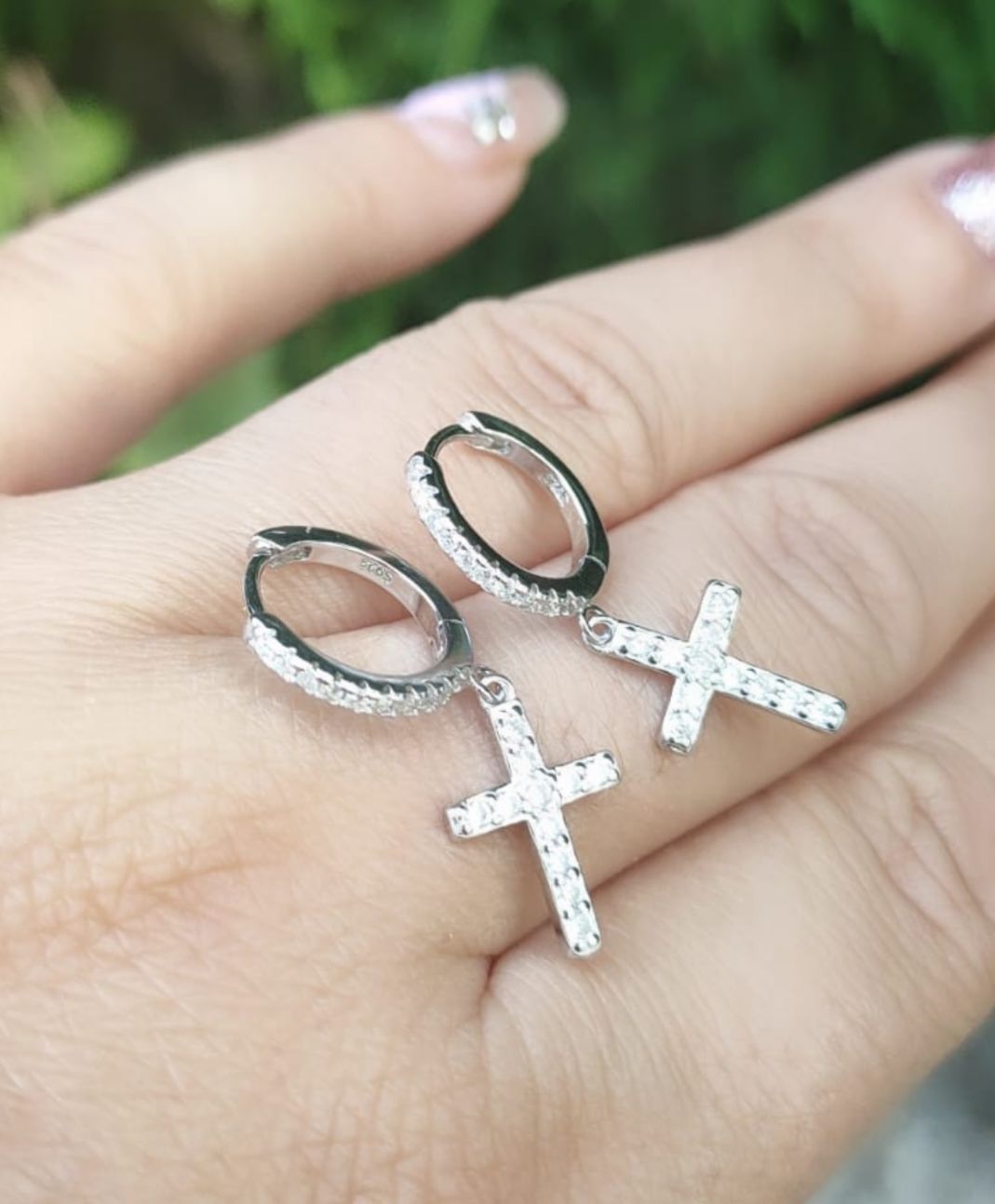 Pendientes de aro y cruz hechos de plata primera ley con circonitas