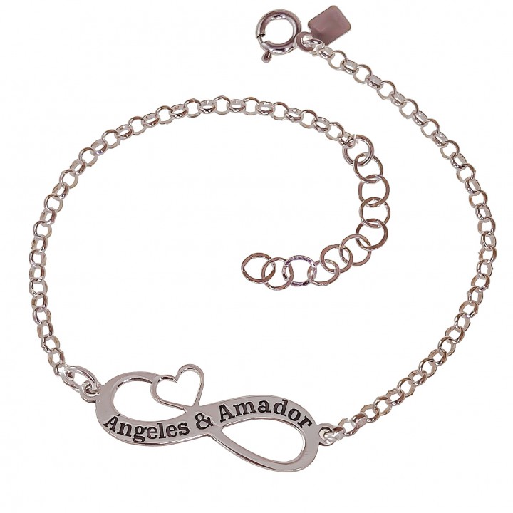 Pulsera plata de ley 925 cadena de rolo de 18 cm largo + cadena adaptable de 3 cm con motivo infinito ( 23mm largo x 8mm ancho ) corazón calado ( 6mm ) y nombres personalizados