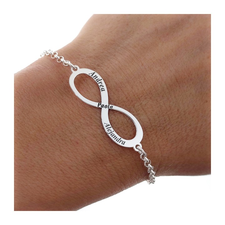 Pulsera plata de ley 925 cadena de rolo de 18 cm largo motivo infinito con nombres personalizados . Motivo infinito de 3 cm largo x 1 cm ancho .