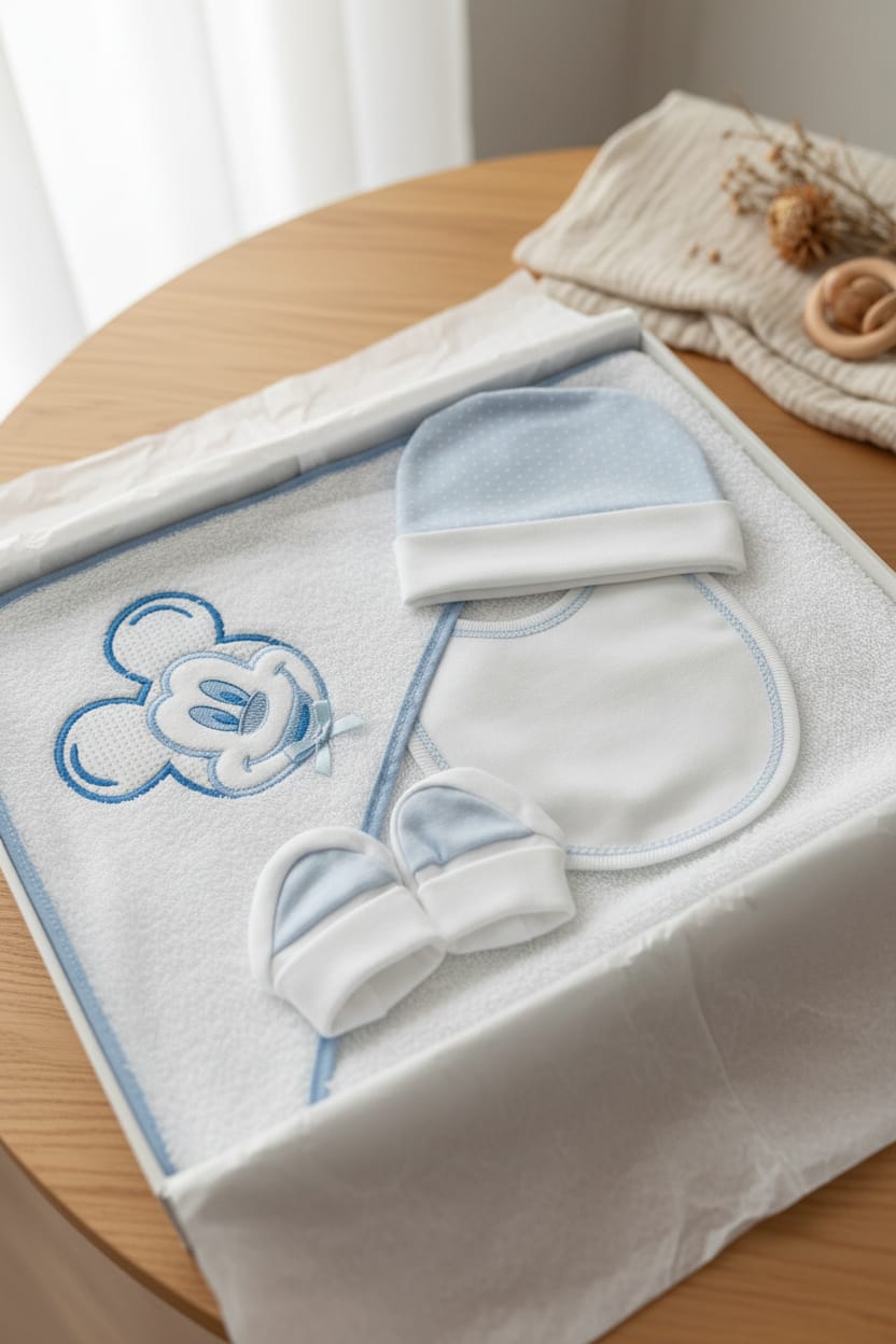 El set de capa de baño con carita de Mickey es una opción ideal para el cuidado diario del bebé. Este completo conjunto incluye capa de baño con capucha, gorrito, patucos y babero, ofreciendo todo lo necesario para mantener al bebé seco, abrigado y cómodo después del baño.