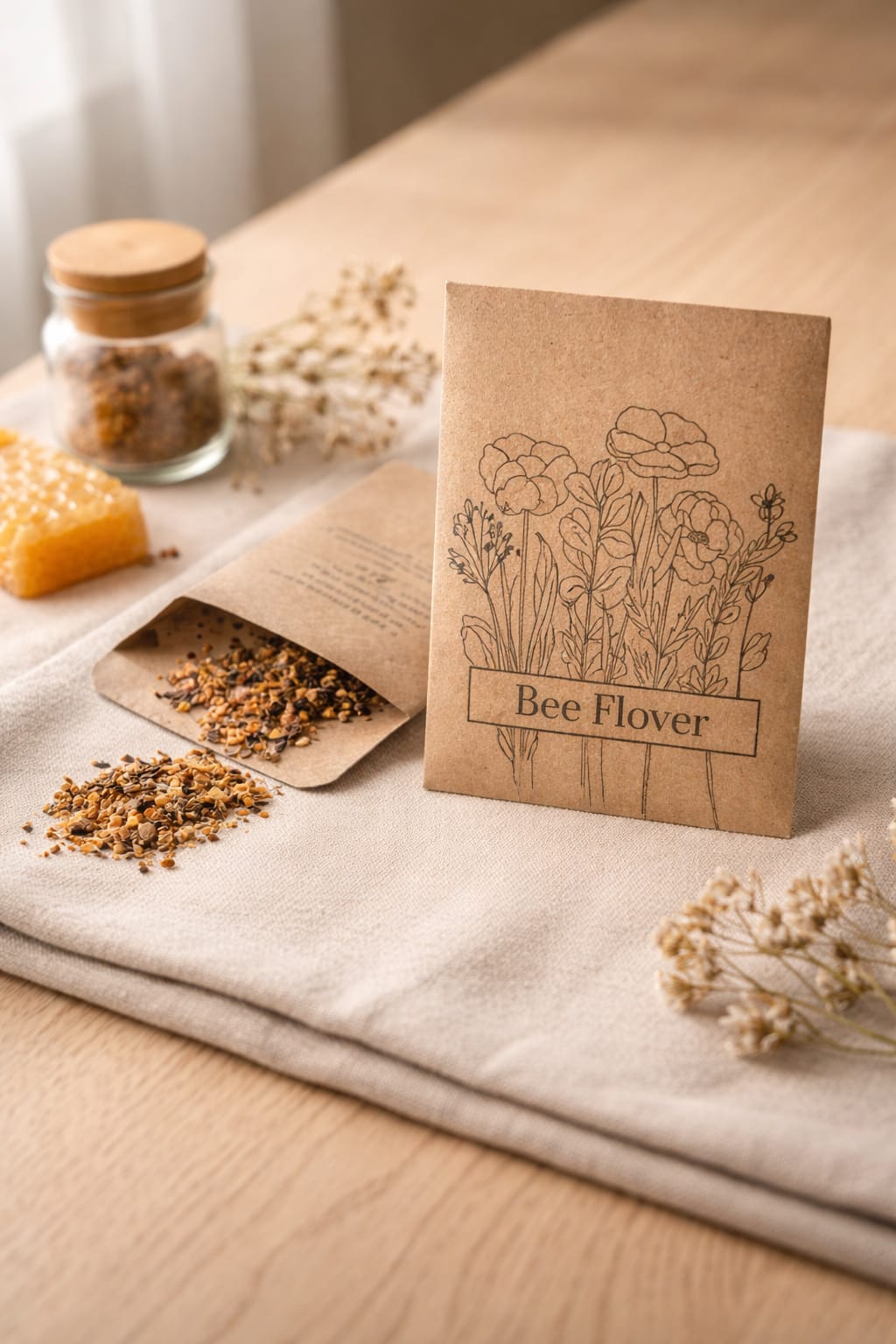 Sobre de papel kraft que contiene una mezcla de semillas de flores silvestres, ideal como obsequio ecológico, permitiendo la siembra directa.